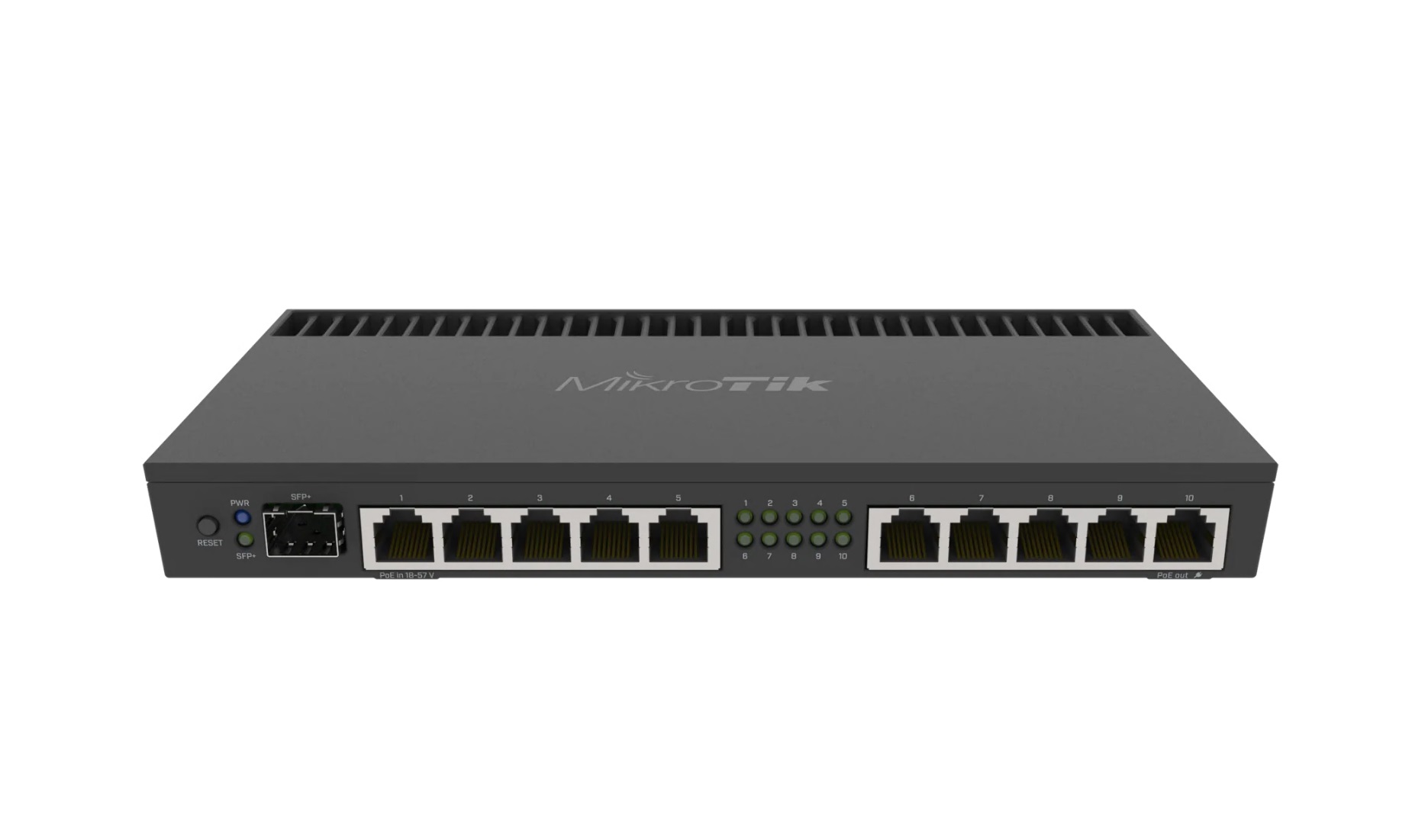 Маршрутизатор поддерживает Passive PoE-in и Passive PoE-out на порту Ether10, что упрощает питание и подключение совместимых устройств. Пассивное охлаждение обеспечивает тихую работу, а прочный металлический корпус и комплектные rack ears позволяют установить устройство в стандартную 1U стойку. Также предусмотрен консольный порт RJ45 для администрирования.